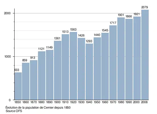 Le graphique suivant résume l'évolution de la population de Cernier entre 1850 et 2008[6]. Sa croissance fut quasiment continue et se distingue donc clairement de l'évolution cantonale qui a vécu une chute brutale dans les années 70 en raison de la crise horlogère.