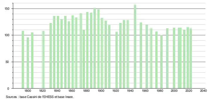 L'évolution du nombre d'habitants est connue à travers les recensements de la population effectués dans la commune depuis 1793. Pour les communes de moins de 10 000 habitants, une enquête de recensement portant sur toute la population est réalisée tous les cinq ans, les populations de référence des années intermédiaires étant quant à elles estimées par interpolation ou extrapolation[25]. Pour la commune, le premier recensement exhaustif entrant dans le cadre du nouveau dispositif a été réalisé en 2008[26].