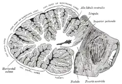 Chez l'humain, ces lobes divisent le cervelet de haut en bas. En termes de fonction cependant, la distinction est plus importante le long du sillon postéro-latéral. En laissant de côté le lobe flocculo-nodulaire, qui a des fonctions et des connexions distinctes, le cervelet peut être séparé fonctionnellement en un secteur médian appelé spinocerebellum, et un secteur latéral plus large appelé cerebrocerebellum[6]. L'étroite bande de tissu protubérant le long de la ligne médiane est appelée vermis[6].