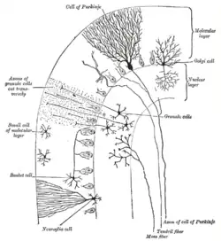 Les cellules de Purkinje font partie des neurones les plus faciles à reconnaitre du système nerveux. Ce sont ainsi les premiers spécimens neuronaux à avoir été décrits, la première fois par l'anatomiste tchèque Jan Evangelista Purkinje en 1837. Elles sont caractérisées par la forme de leur arbre dendritique : les branches dendritiques sont abondantes, mais sont sévèrement aplaties dans un plan perpendiculaire au repli du cortex cérébelleux. Les dendrites des cellules de Purkinje forment ainsi un réseau plan très dense, au travers lequel passent perpendiculairement les fibres parallèles[5]. Leurs dendrites sont couvertes d'épines dendritiques, chacune d'elles formant une synapse avec une fibre parallèle. Les cellules de Purkinje forment davantage de synapses que n'importe quel autre type de cellule dans le cerveau - on estime que le nombre d'épines dendritiques sur une seule cellule de Purkinje humaine peut monter jusqu'à 200 000[5].