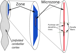 - La définition initiale d'une microzone est un groupe de cellules de Purkinje partageant un même champ récepteur somatotopique. Cette définition n'a de sens que dans les régions du cervelet pourvue d'entrées somato-sensorielles. Chaque microzone comprend environ 1 000 cellules de Purkinje, disposées dans une rayure longue et étroite, orientées perpendiculairement aux replis du cervelet[13]. Ainsi, les dendrites des cellules de Purkinje sont aplaties dans la même direction au fur et à mesure de l'extension de la microzone, tandis que les fibres parallèles les croisent à angle droit.