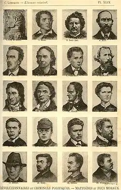 Marco Ezechia Lombroso, dit Cesare Lombroso (prononcé : [ˈtʃeːzare lomˈbroːzo]), né le à Vérone, au sein d'une famille juive[1], mort le à Turin, est un professeur italien de médecine légale et l'un des fondateurs de l'École italienne de criminologie[2]. Il est célèbre pour ses thèses sur le « criminel né » : à partir d'études craniologiques[3] et phrénologiques, il tentait de repérer les criminels en considérant qu'il s'agissait d'une classe héréditaire qu'on pourrait distinguer par l'apparence physique[4]. Ses théories étaient fortement marquées par la théorie de la dégénérescence, le racialisme et le transformisme[4]: il considérait ainsi que l'humanité avait évolué en partant des « Noirs » vers les « Jaunes » et enfin les « Blancs ». Au sein même de l'Italie, il distinguait la « race du sud » inférieure à la « race du nord », tandis qu'il considérait que les femmes étaient moins sujettes à la criminalité en raison de leur moindre intelligence et de la nature plus inactive de leur vie[5].