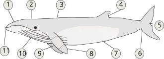 Les cétacés partagent tous un certain nombre de caractères morphologiques : un corps lisse et fuselé, ce qui facilite la pénétration dans l'eau, un système pileux quasi inexistant, l'absence de griffes, pas d'oreilles externes et le conduit auditif est fermé[3]. Les membres antérieurs et la queue des cétacés ont évolué en nageoires. La nageoire caudale appelée palette, très puissante, est horizontale, contrairement à celles des poissons. Elle assure la propulsion tandis que les nageoires latérales assurent l'équilibre et le maintien de la direction. L'aileron dorsal fait office de stabilisateur comme la quille d'un bateau. Comme les autres mammifères, les cétacés respirent à l'aide de poumons et doivent régulièrement faire surface pour respirer avec leur évent situé au sommet du crâne.