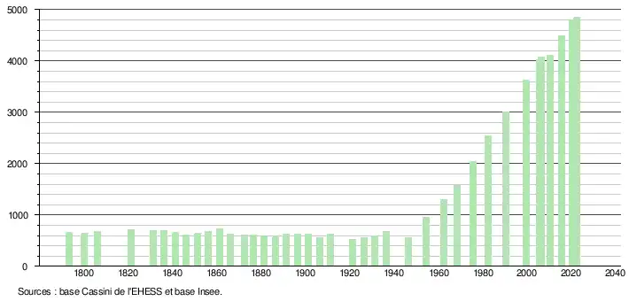 L'évolution du nombre d'habitants est connue à travers les recensements de la population effectués dans la commune depuis 1793. Pour les communes de moins de 10 000 habitants, une enquête de recensement portant sur toute la population est réalisée tous les cinq ans, les populations de référence des années intermédiaires étant quant à elles estimées par interpolation ou extrapolation[22]. Pour la commune, le premier recensement exhaustif entrant dans le cadre du nouveau dispositif a été réalisé en 2005[23].
