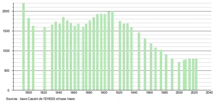 L'évolution du nombre d'habitants est connue à travers les recensements de la population effectués dans la commune depuis 1793. Pour les communes de moins de 10 000 habitants, une enquête de recensement portant sur toute la population est réalisée tous les cinq ans, les populations de référence des années intermédiaires étant quant à elles estimées par interpolation ou extrapolation[28]. Pour la commune, le premier recensement exhaustif entrant dans le cadre du nouveau dispositif a été réalisé en 2008[29].