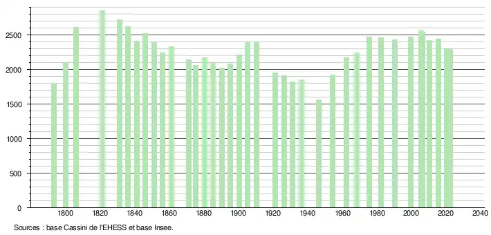 - ↑ Fiches Insee - Populations de référence de la commune pour les années 2006, 2007, 2008, 2009, 2010, 2011, 2012, 2013, 2014, 2015, 2016, 2017, 2018, 2019, 2020, 2021 et 2022.