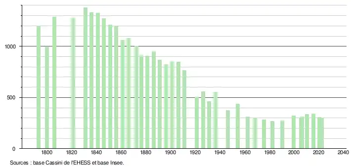 L'évolution du nombre d'habitants est connue à travers les recensements de la population effectués dans la commune depuis 1793. Pour les communes de moins de 10 000 habitants, une enquête de recensement portant sur toute la population est réalisée tous les cinq ans, les populations de référence des années intermédiaires étant quant à elles estimées par interpolation ou extrapolation[18]. Pour la commune, le premier recensement exhaustif entrant dans le cadre du nouveau dispositif a été réalisé en 2005[19].