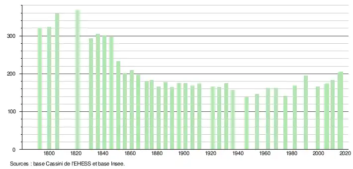 L'évolution du nombre d'habitants est connue à travers les recensements de la population effectués dans la commune depuis 1793. Pour les communes de moins de 10 000 habitants, une enquête de recensement portant sur toute la population est réalisée tous les cinq ans, les populations de référence des années intermédiaires étant quant à elles estimées par interpolation ou extrapolation[2]. Pour la commune, le premier recensement exhaustif entrant dans le cadre du nouveau dispositif a été réalisé en 2005[3].