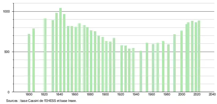 L'évolution du nombre d'habitants est connue à travers les recensements de la population effectués dans la commune depuis 1800. Pour les communes de moins de 10 000 habitants, une enquête de recensement portant sur toute la population est réalisée tous les cinq ans, les populations de référence des années intermédiaires étant quant à elles estimées par interpolation ou extrapolation[29]. Pour la commune, le premier recensement exhaustif entrant dans le cadre du nouveau dispositif a été réalisé en 2008[30].