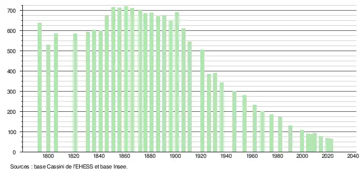L'évolution du nombre d'habitants est connue à travers les recensements de la population effectués dans la commune depuis 1793. Pour les communes de moins de 10 000 habitants, une enquête de recensement portant sur toute la population est réalisée tous les cinq ans, les populations de référence des années intermédiaires étant quant à elles estimées par interpolation ou extrapolation[20]. Pour la commune, le premier recensement exhaustif entrant dans le cadre du nouveau dispositif a été réalisé en 2004[21].