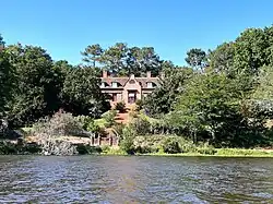 La façade principale donne sur le lac. On peut y accéder par un grand escalier partant du débarcadère et menant jusqu'à l'entrée principale de la demeure. Malgré son style imitant l'architecture coloniale du Cap, le bâtiment s'intègre à son environnement, grâce à son habile association de briquettes et de colombages typique de la région et présente dans certaines maisons landaises du pays de Born[a], [4].