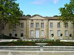 L'édifice présente une grande simplicité. Un avant-corps central suffit à animer la façade qui comporte un étage noble sur rez-de-jardin. Sous le toit de tuiles creuses, le fronton de l'avant-corps montre un deuxième niveau percé d'oculus à la manière méridionale.