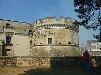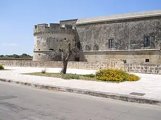 Cette forteresse est parmi les plus innovantes et les mieux entretenues de tout le vice-royaume de Naples, en effet Dell'Acaya fut l'un des architectes militaires les plus célèbres du XVIe siècle. Au sommet sud-est de cette forteresse, il inséra un rempart en forme de lance, avec escarpement et défense et artilleurs sur deux niveaux, une défense rasante fut ici testée pour la première fois. Une épigraphe sur le bastion rappelle la fin des travaux en 1536. La famille Acaya s'occupa non seulement de la construction de la forteresse, mais aussi de la défense de toute la ville, en utilisant également les concepts militaires les plus modernes. l'architecture, comme les rideaux en retrait pour une meilleure défense. Le manoir avait une fonction contre les incursions turques, mais il vaut mieux ne pas exagérer cet aspect, en effet ce château aurait pu aussi avoir un rôle important dans le contrôle du territoire du Salento, pour le règne naissant de Charles Quint. Le château, cependant, n'avait pas seulement une fonction défensive, un exemple en est surtout la salle ennéagonale, de la tour NE enrichie de précieuses frises. L'ensemble du système est enrichi de diverses armoiries de la famille Acaya.