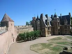 - la partie médiévale : elle vaut au château d'Ainay-le-Vieil d'être surnommé « le petit Carcassonne »[4]. En effet, de l'époque féodale nous est parvenu une enceinte octogonale du XIVe siècle construite sur l'emplacement d'une forteresse du XIIe siècle. Les hauts murs crénelés sertis de neuf tours sont équipées de meurtrières et d'un chemin de ronde. Ces courtines montant presque jusqu'au sommet des tours sont une disposition typique du XIVe siècle, permettant une meilleure circulation des défenseurs. L'aspect militaire l'emporte : l'entrée de la forteresse est défendue par un puissant châtelet qui, outre un système d'assommoir, était pourvu d'un pont-levis. Il est aujourd'hui remplacé par un pont dormant. Les douves, toujours en eaux, correspondent à un ingénieux système de canaux arrosant les jardins ;