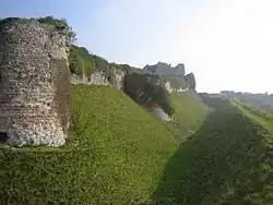 1. La forteresse est sans doute composée d'un donjon de bois enclos dans une enceinte palissadée, précédée par un profond fossé creusé au sommet de l'escarpement, selon un agencement typiquement normand[3].