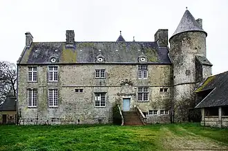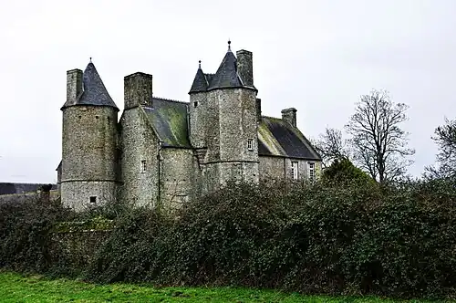 Le logis, entouré de vastes communs, présente une grosse tour ronde, engagée près de son entrée, et sur son arrière une autre tour polygonale flanquée d'une échauguette. La porte, datée du XVIIe siècle[4], précédée d'un perron, est richement sculptée.