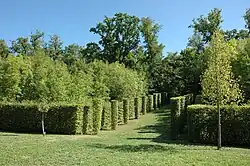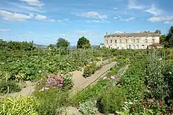 Du côté jardin, on trouve un potager en terrasse entouré de buis, un jardin fleuri et un jardin gourmand bordé de 7 ha de bosquets, abritant cabinets et chambre de verdure, mail, ha-ha, quinconce et allées de charmilles.