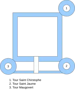 Le fort a lui-même le plan d'un carré avec des côtés d'une longueur de 28 mètres, flanqué de 3 tours cylindriques constituées de casemates superposées avec des chambres de tir et des embrasures de bouches à feu. Ces tours massives sont détachées des courtines sur les trois quart de leur surface, ce qui les différencie des tours médiévales et préfigure l'idée du bastion. * Les casemates et les embrasures remplacent les archères et les créneaux. La tour Saint-Christophe (1) ou donjon dans le nord-ouest est la plus haute tour (22 m de hauteur) et permet de verrouiller le principal chenal de navigation[14].