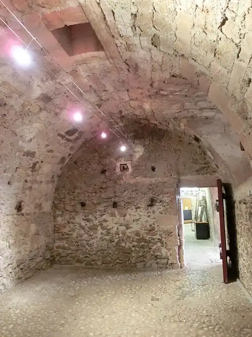 - ↑ Cette pièce est une reconstitution touristique. Il s'agit en fait de cellules collectives du rez-de-chaussée qui étaient auparavant des magasins (à poudre, à grains, à vivres). Les trous de boulin destinés à recevoir les solives indiquent la présence d'un plancher et les conditions des détenus qui ne pouvaient se tenir debout[45].