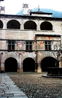 Sa cour intérieure est très célèbre, avec la fontaine du grenadier et les arcades décorées à fresque avec des scènes de vie quotidienne du bas Moyen Âge.