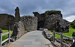 Vue de la basse-cour, montrant la porterie (à gauche), la tour Grant, la série de bâtiments (à droite) et les fondations de la chapelle (au centre).