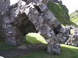 - Vue depuis la motte castrale montrant l'emplacement du pont-levis et les restes de la porterie sur la droite.