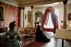 Les soieries du XVIIIe siècle, (dites gros de Tours rouge cerise), aux motifs d'inspiration chinoise, ont été réalisées dans les manufactures de Tours. L'ensemble du mobilier date de 1770. Le salon et le lit à baldaquin (dit à la polonaise) sont de style Louis XVI. Le miroir de Venise date du XVIIe siècle. Les quatre commodes sont de styles différents : deux de style Régence, une de style Louis XV et la dernière de style Transition. Le parquet en chêne à caissons date du XVIIe siècle.