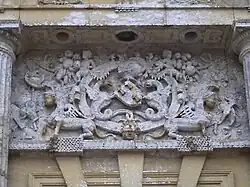 Dessin de Louis Boudan, 1696.- L'entrée du logis et sa tomette ornée des entrelacs des marquis de Bailleul.