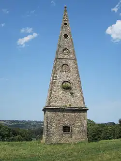 Le parc anglais d'une superficie de cent hectares, aménagé, vers 1820, sous la Restauration, par le comte Alexandre du Moncel[16], comporte bois, prairies, étangs, cascade, des sculptures (deux lions soutenant deux colonnes torses en marbre de Vérone, une statue de femme en marbre de Gaetano Motelli) et des fabriques dont un obélisque (« haute folie ») du XVIIIe siècle, probablement ériger par Alexandre du Moncel, sur une hauteur à la limite avec Hardinvast, au bout d'une avenue menant au château. Il s'agit d'une tour de plusieurs mètres de hauteur avec une toiture très pointue percée sur chaque face de cinq oculi, et à laquelle on accède par un escalier intérieur[12].
