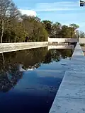 - le miroir d'eau, canal construit à l'est du jardin à la française et du logis. Ce miroir d'eau est flanqué de deux exèdres en banquette de pierre ;