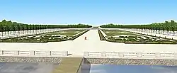 Mais pour revenir à nostre chasteau, il est magnifique, et superbement basti de pierre de taille, et brique, en forme carrée, si ce n'est le département des offices qui est un peu séparé, et n'est de pareille haulteur. Devant que d'y entrer il faut passer les fossez qui sont médiocrement profonds, mais bien bastis de pierre de taille for proprement, remplis d'eau et de poissons. Il y a du costé de l'entrée deux grandes portes cochères à pont-levis, qui se lèvent ; et doubles fossez seulement de ce costé, d'autant que le reste est comme compris dans le jardin, et enclos de ses murailles. Entre ces deux fossez est une terrasse carrée, vis à vis de laquelle est le chemin de Dammartin, eslongné de deux lieues, mais qu'on voit assez à plein pour estre eslevé sur une montagne, lequel chemin est par l'espace d'une lieue bordé de quatre grandes rangées d'ormes, qu'a faict, pour la plupart, planter Monsieur le Cardinal, ce qui est fort beau à voir.