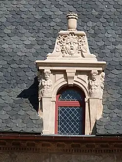 L'entrée du château est marquée par un porche à deux tours tronquées, qui est un vestige de l'ancienne enceinte du premier château médiéval. Cette enceinte couvrait une surface bien supérieure à celle du château actuel. Le château Renaissance que l'on peut voir aujourd'hui se présente sous la forme de deux corps de logis en L. La galerie, qui rappelle un arc de triomphe, est l'ancienne façade d'une aile démontée au XIXe siècle[14].
