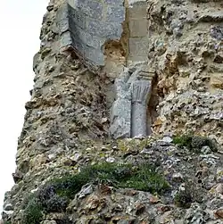 En outre, le premier étage résulterait de la fusion de deux niveaux différents. En effet, des traces de deux voûtes comblées superposées sont visibles dans le mur ouest[16]. La voûte inférieure correspond à un espace qui est agrémenté d'une cheminée dont l'un des piédroits, surmonté d'un chapiteau sculpté, existe toujours. Il apparaît donc peu probable que ces deux niveaux antérieurs aient été des galeries de circulation.