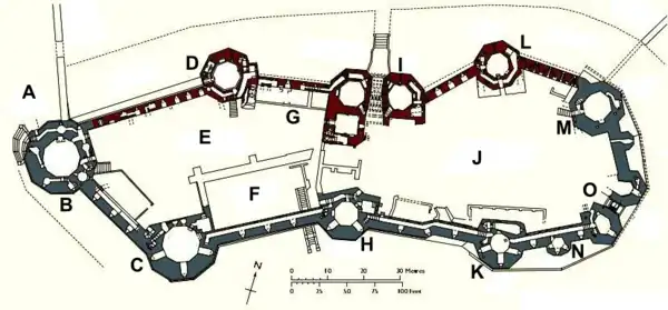 L'enceinte du château comprend plusieurs tours polygonales offrant aux défenseurs des fenêtres de tir latérales, ainsi que des positions de tir du côté sud (celles du côté nord, envisagées, n'ont jamais été construites), faisant de Caernarfon « l'une des plus importantes concentrations de puissance de feu de tout le Moyen Âge » d'après l'historien Reginald Allen Brown[24]. La plus grande tour du château est la tour de l'Aigle (Eagle Tower), à l'ouest. Elle doit son nom aux statues d'aigles qui surmontaient à l'époque ses trois tourelles[24]. Ses spacieux appartements ont probablement été aménagés pour Othon de Grandson, le premier justiciar du pays de Galles[25],[26]. Les caves du château étaient accessibles par une porte donnant sur la Seiont[25]. Il était approvisionné en eau par un puits situé dans la tour du Puits (Well Tower), au nord-ouest[27].