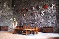 Dans la cour intérieure se trouvaient la grande salle et les logements du château. Les logements de Caerphilly étaient chics, de haut standing, semblables à ceux construits à la même époque au château de Chepstow (en). Durant la période médiévale, la grande salle aurait été subdivisée avec des paravents en bois. À l'intérieur, on y trouvait des décorations colorées, de riches et minutieuses sculptures, et une grande cheminée centrale pour chauffer la pièce. Des corbeaux médiévaux sculptés en forme de têtes d'hommes et de femmes sont encore visibles dans la salle aujourd'hui, ils représentent peut-être la cour royale des années 1320, dont Édouard II, Isabelle de France, Hugh Despenser et Éléonore de Clare. À l'est de la grande salle se trouvait la chapelle du château, placée au-dessus de l'office (en) et du cellier. À l'ouest, il y avait les appartements privés du château, deux bâtiments solaires dotés de luxueuses installations.