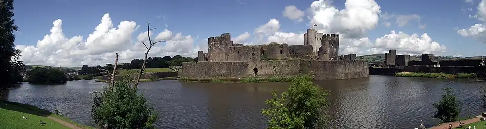 Le château de Caerphilly (en gallois : Castell Caerffili) est un château normand du XIIIe siècle situé au cœur de la ville de Caerphilly, dans le sud du pays de Galles. L'une de ses particularités est de posséder une tour penchée, la Leaning Tower. Le château fut construit par Gilbert de Clare au XIIIe siècle dans le cadre de sa campagne pour conquérir Glamorgan, et fut le témoin de combats intenses entre Gilbert, ses descendants et les dirigeants gallois locaux. Entouré de vastes lacs artificiels - considérés par l'historien Allen Brown être « les moyens de défense en eau les plus élaborés de toute la Grande-Bretagne » - il occupe environ 30 hectares et arrive deuxième dans le classement des plus grands châteaux de Grande-Bretagne. Il est célèbre pour avoir introduit en Grande-Bretagne les moyens de défenses caractéristiques des châteaux concentriques et pour ses grands corps de garde.