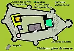Le château est constitué d'une enceinte haute avec donjon de l'an mil, corps de logis et deux tours, ainsi que d'un rempart bas à huit tours ouvertes à la gorge du XVe siècle. De la chapelle castrale extérieure à l'enceinte basse, il ne subsiste qu'un petit pan de mur.