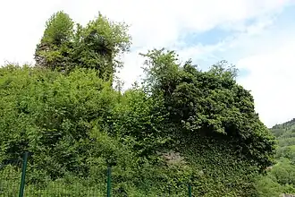 Les ruines de la tour apparaissent à droite dans la végétation. | |||