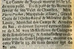 "Le Comte de Joyeuse mourut ici le 26 du mois passé. Il a disposé de ses biens en faveur de son valet de Chambre. Mre Pierre Puchet, Marquis des Ailleurs, Grand Croix de l'Ordre Royal & Militaire de St. Louis, Maréchal des Camps & Armées du Roi, ci-devant Envoyé extraordinaire de S. M. vers les Électeurs de Cologne & de Brandebourg, & Ambassadeur ordinaire près du Grand Seigneur, mourut en cette ville le 25 du mois dernier, âgé de 82 ans."[10]