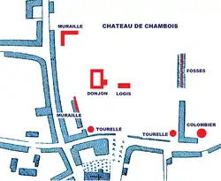 L'enceinte de Chambois, sur le coteau de la Dive, est entourée par le bourg. Par les textes et les fouilles, on peut retrouver : à l'est du donjon, l'ancien logis construit en 1575 et détruit vers 1740 ; au nord-ouest et à l'ouest, des restes de muraille ; à l'est, un fossé comblé en jardin ; au sud, deux tourelles qui marquent les limites de la forteresse. Un colombier semble se situer à l'extérieur au sud-est[7]. Jusqu'au XVIIIe siècle, le donjon fut entouré d'une enceinte en pierre, qui était cernée par le bourg[8].