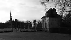 La demeure est ainsi entièrement détruite en 8 semaines, à l'exception de la pagode, acquise le par le duc Louis-Philippe d'Orléans, avec 228 hectares de forêt[14] ; il n'en reste aujourd'hui que le pavillon dit du Concierge et deux pavillons de l'avant-cour encadrant la grille, visibles sur le tableau reproduit ci-contre.