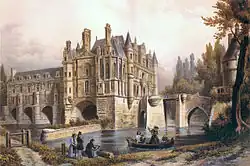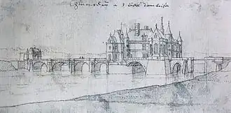 Dessin de Chenonceau après la construction du pont en 1559 et avant celle des galeries en 1576. À gauche, le petit châtelet qui abrite un pont-levis pour accéder aux jardins de la rive gauche du Cher.