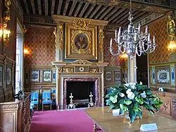 La cheminée monumentale, de style néo-Renaissance, dorée à l'or fin, est surmontée d'un buste du roi Henri IV. Les chenets datent du XVIIe siècle.