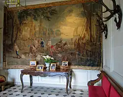 Le vestibule est meublé de bancs tendus de rouge et d'une table à gibier, de style Louis XV, au-dessus de laquelle est accrochée une tapisserie des Flandres représentant le Retour des pêcheurs, d'après les cartons de David Teniers.