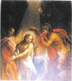 Au centre du tableau, le Christ accompagné de chaque côté par deux anges, reçoit le baptême de Jean- Baptiste. En haut du tableau, Dieu le père, couronné du symbole de la Trinité, est entouré d’angelots. Un rayon lumineux centré sur la colombe, descend vers le personnage central. Un ange, au centre de la composition, nous regarde intensément.