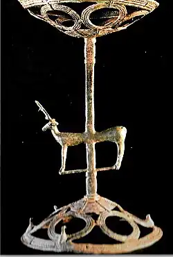 Un objet très particulier, a été signalé par le propriétaire Jean Sarrand dans la partie centrale de la parcelle, qui a permis de localiser les premières tombes: un Thymiatérion (brûle-parfum), à la tige ornée d’un cerf et portant à chaque extrémité deux coupelles ajourées, celle du bas étant décorée de six petits oiseaux, tout de bronze également.