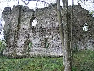 L'habitation ainsi désignée est le logis du XVIe siècle qui se trouve au village, au bas de la vallée, et non la vieille ruine dont il n'est pas question. Actuellement encore elle présente pourtant un aspect imposant, située sur un mamelon (170 m) profondément vallonné. La partie ouest, vaste pièce carrée dont les murs épais de 2 m ont encore plus de 15 m de hauteur, constituait un donjon qu'on peut croire à peu près contemporain de ceux de Villaines et de Sainte-Suzanne, comme l'indique l'appareil en feuilles de fougères de quelques assises. Les autres constructions accolées à cette forteresse principale sont moins solides, et les murs moins épais. On doit voir dans Courtaliéru un château de la première époque de la féodalité, et dont l'histoire finit avant les guerres anglaises, car, en dépit de quelques récits romanesques qu'on applique dans le pays à ces ruines, et qui se retrouvent partout, aucun fait de guerre n'est mentionné dans les chroniques du XIVe siècle ni du XVe siècle[1]. Quant aux souterrains, M. le baron de Wismes en parle après plusieurs autres, mais ils n'ont jamais été visités. Là comme ailleurs, on a pris pour des galeries profondes ce qui n'était que l'amorce de caveaux ordinaires ou grottes dans le calcaire.