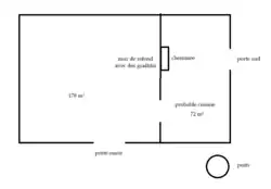 On trouve deux portes, une principale à l'ouest, haute de trois mètres, et une deuxième plus petite sur la façade sud. Des trous semblables à des trous de boulin se situent de parte et d'autre des portes.