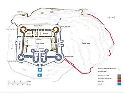 L'entrée principale était située derrière un pont en pierre franchissant la tranchée du côté est. Il ne subsiste quasiment rien des tours protégeant ce pont, qui a été remplacé par une rampe d'accès en bois[26]. De l'autre côté, une porte mène à un escalier de 127 marches protégé par un mur qui descend jusqu'au pied de la falaise. Cette voie permettait le ravitaillement du château par la mer, mais le littoral a reculé depuis[27]. Le corps de garde adopte un style populaire au XIIIe siècle, avec deux tours en forme de D de part et d'autre de l'entrée, protégée par trois herses et au moins deux portes[28],[29]. Il est construit sur trois étages, avec de grandes fenêtres et des cheminées aux étages supérieurs[30]. Pour Arnold Taylor, le premier étage abritait les appartements du connétable et le second, des chambres pour les visiteurs importants. Jeremy Ashbee considère que ces derniers devaient plutôt être logés dans la haute-cour et que le corps de garde avait une autre utilité[31],[32].