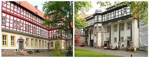 Le château actuel est composé de quatre ailes disposées en rectangle, avec une cour intérieure (40 × 58 m). Il est la reconstruction du château fort d'origine, après l'incendie en . La reconstruction est achevée en 1528. Le soubassement est en grès. Une des ailes a des étages en pierre, les trois autres ailes ont leur étages construits en colombages.